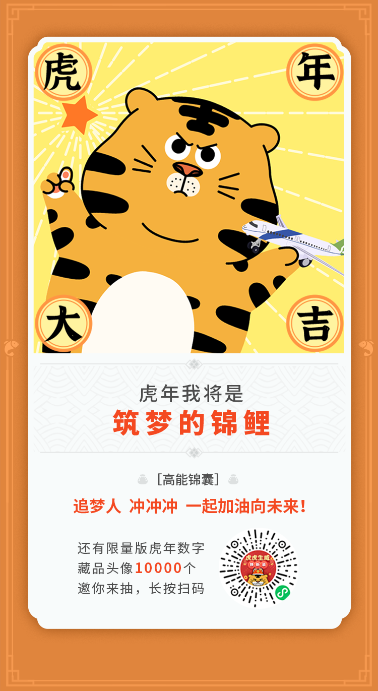 此次福卡将祖国的大目标与个人的小目标紧密结合,每张幸运虎都承载着追梦人对新一年的美好期望,脚踏实地、勤劳奋进,梦想必能展翅飞翔。同时,我们辅以“幸运虎”卡通老虎形象以及选取每种祝福相关辅助元素,组合10000个各不相同、独一无二的数字藏品,这10000个特别版本,通过腾讯区块链提供的数据上链支持,成为了拥有唯一编码和唯一形象的数字藏品,用户可以通过多次扫码随机获得,此藏品具有唯一、不可替代属性。活动结束后用户仍可以在腾讯区块链“时空藏馆”小程序查看自己的数字藏品。新年伊始,扫码、分享、点赞三连,一起智享虎年福气!