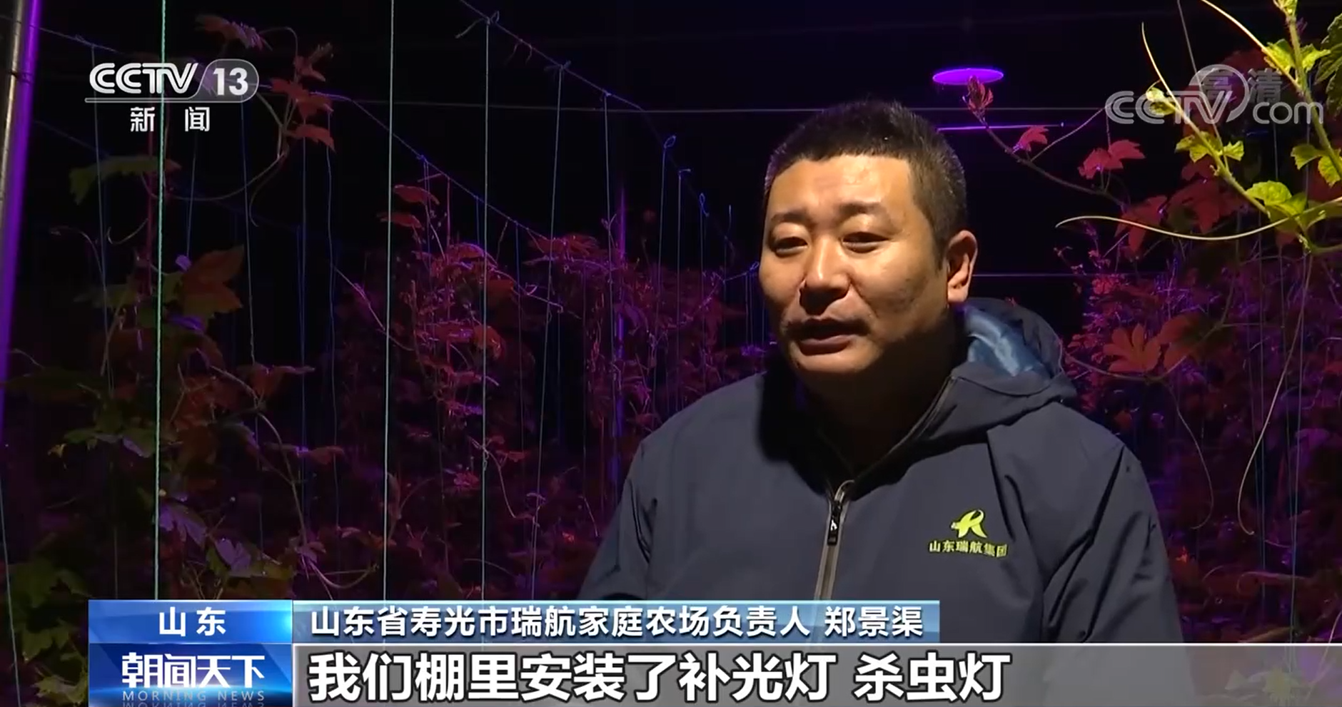 山东省寿光市瑞航家庭农场负责人 郑景渠:我们棚里安装了补光灯、杀虫灯,还有微喷滴灌等设施,解决了植物阴天浇水的问题;再一个补光灯及时补光,对作物生长非常有好处,比没安补光灯的(大棚)增产20%。