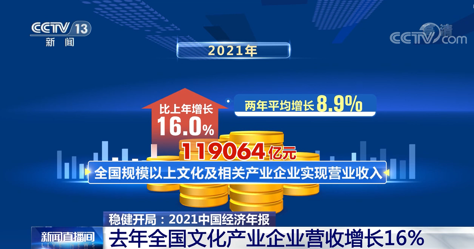 央视网消息:国家统计局今天(1月30日)发布数据显示,2021年,全国6.5万家规模以上文化及相关产业企业营业收入比上年增长16%,行业整体恢复情况良好。