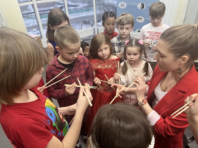 俄罗斯儿童体验筷子的使用。中俄人文合作发展中心供图