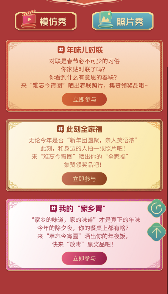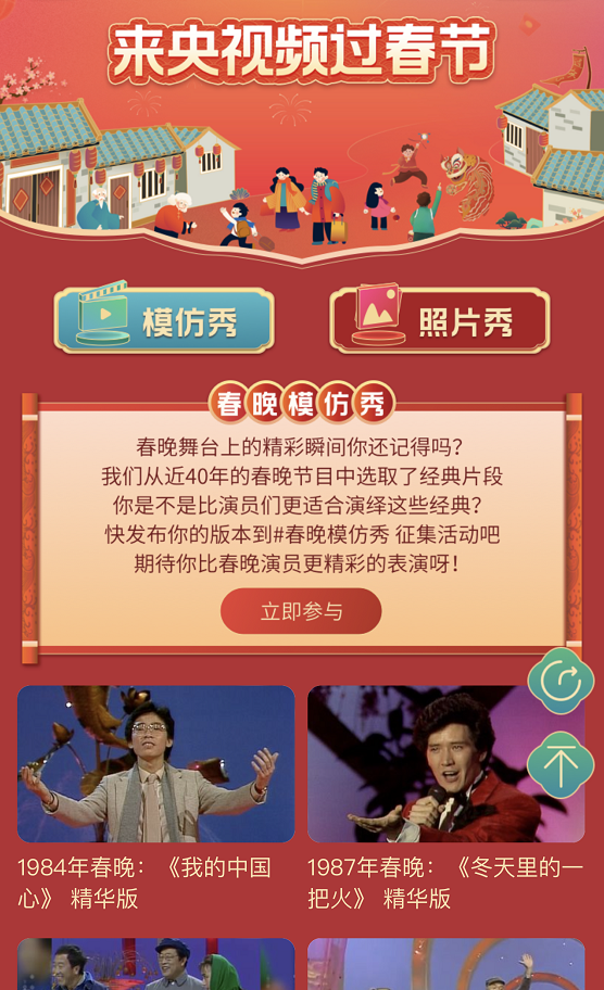 《Young在春晚》轻量级的节目内容设计丰富了春晚季的表达形式,通过为观众设计更好的互动方式,拉近了大小屏幕之间的距离。一方面,12+小时的直播节目中福利将不停歇放送。直播期间将推出多轮截屏抽奖,观众还可点击直播间春晚频道页面的浮球、在央友圈参与“雪花”相关互动话题讨论,均有机会获得总台倾力打造的各类精美文创奖品。另一方面,央视频还上线“花Young看春晚”互动区,网友可参与“春晚模仿秀”“年味儿对联”“此刻全家福”“家乡胃”四大征集活动,上传作品至“央友圈”即可集赞夺奖。