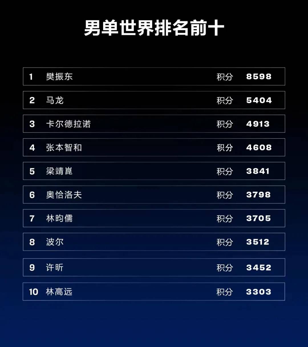 男单方面,樊振东依然位居榜首,马龙紧随其后。巴西选手卡尔德拉诺刷新个人最高纪录首次跻身世界第三,梁靖崑首次排列前五,许昕和林高远分列第九和第十位。