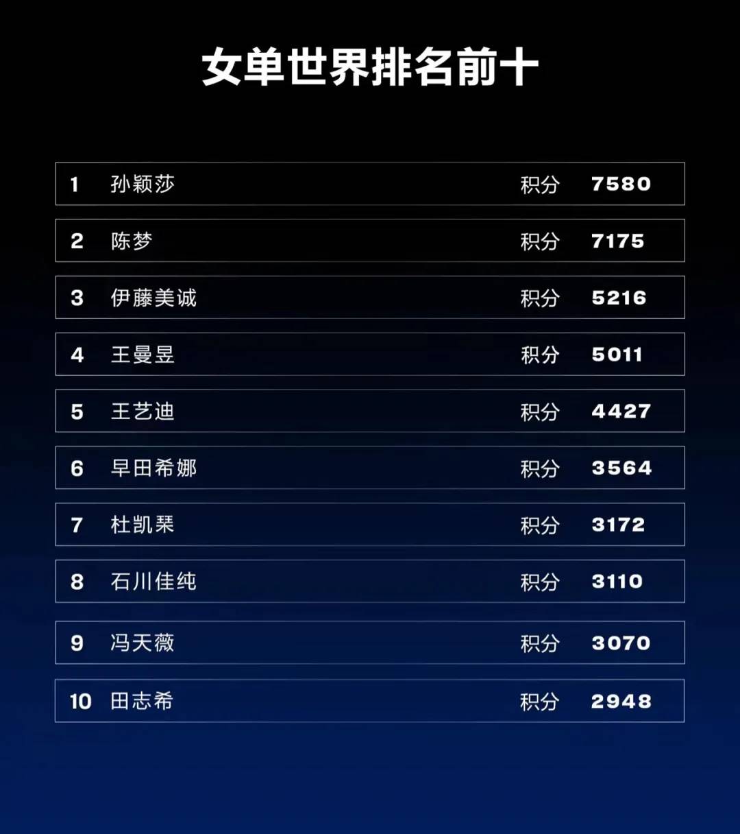 女单方面,孙颖莎首登女单世界排名第一位!陈梦位列第二,排在第三的是日本选手伊藤美诚,王曼昱和王艺迪分列第四、五位。此外,日本选手早田希娜和中国香港选手杜凯琹排名大幅度上升至第六和第七,韩国选手田志希跻身女单前十。