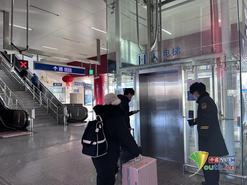 车站工作人员在引导携带大件行李乘客乘坐直梯。国展地铁站供图