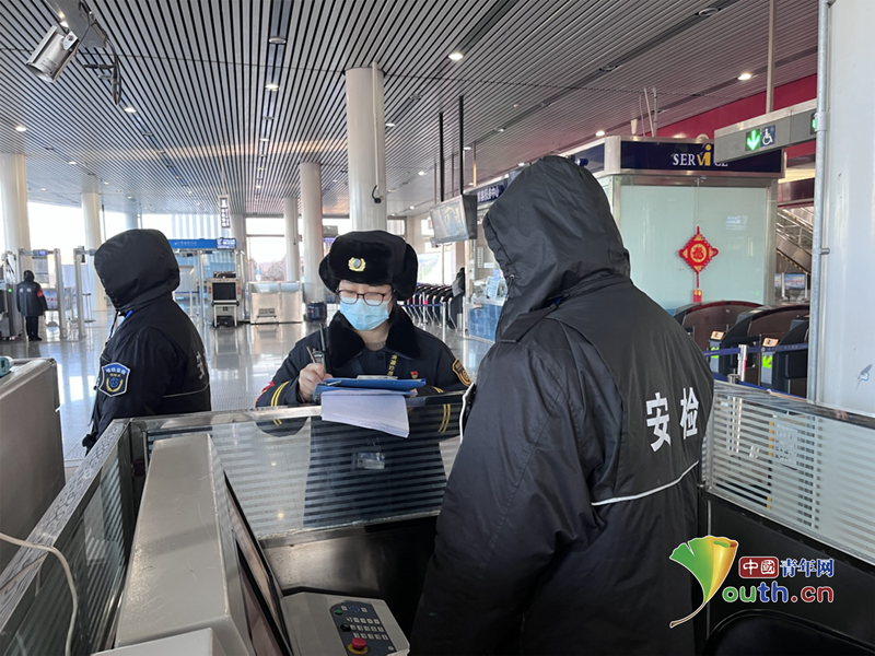 车站值班站长在安检点检查人员值岗、疫情防控工作落实情况。国展地铁站供图