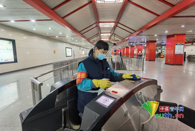车站保洁员在对进站闸机进行消毒。马泉营地铁站供图