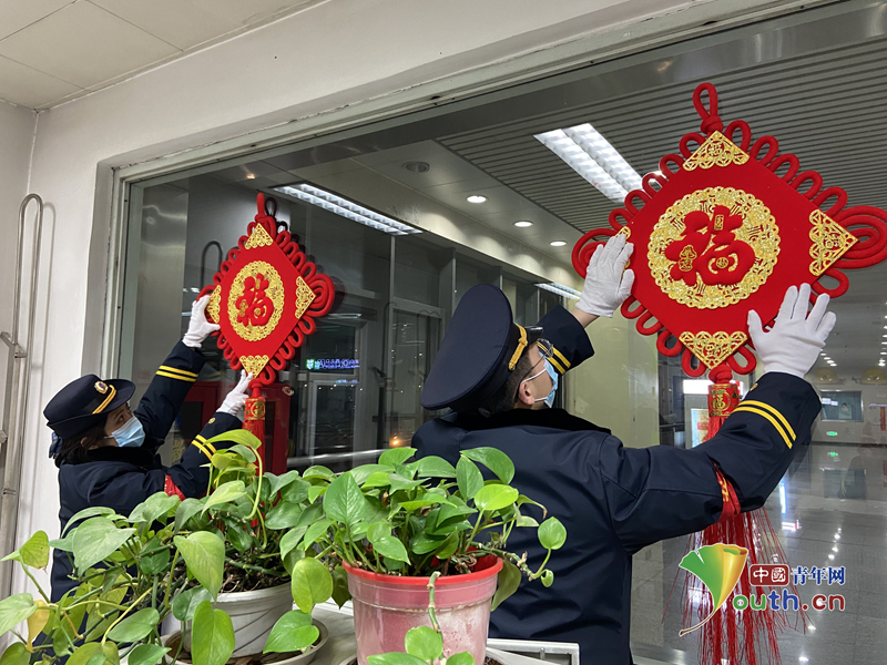 车站工作人员在综控室挂上福字营造喜庆的春节氛围。孙河地铁站供图