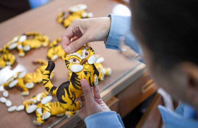 在丰宁满族自治县非遗布糊画就业工坊,手工艺人在检验成品布糊画。