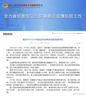 截至1月30日24时,据31个省(自治区、直辖市)和新疆生产建设兵团报告,现有确诊病例1937例(其中重症病例10例),累计治愈出院病例99500例,累计死亡病例4636例,累计报告确诊病例106073例,现有疑似病例4例。累计追踪到密切接触者1522986人,尚在医学观察的密切接触者38879人。
