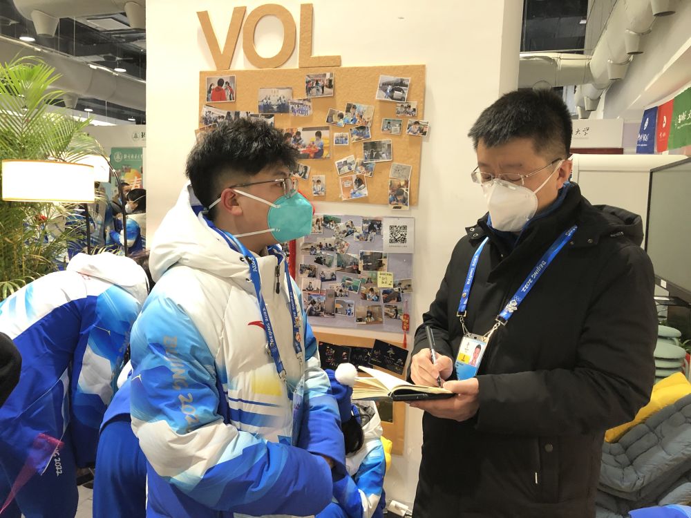 1月30日,本文作者在主媒体中心志愿者之家采访志愿者。新华网向博摄