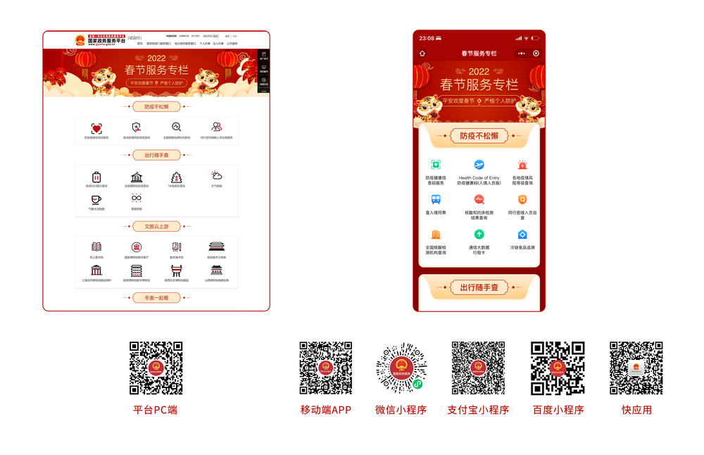 目前,“春节服务专栏”已在国家政务服务平台各端上线,专栏设置了“防疫不松懈”“出行随手查”“文旅云上游”“冬奥一起看”“民生有保障”等版块。