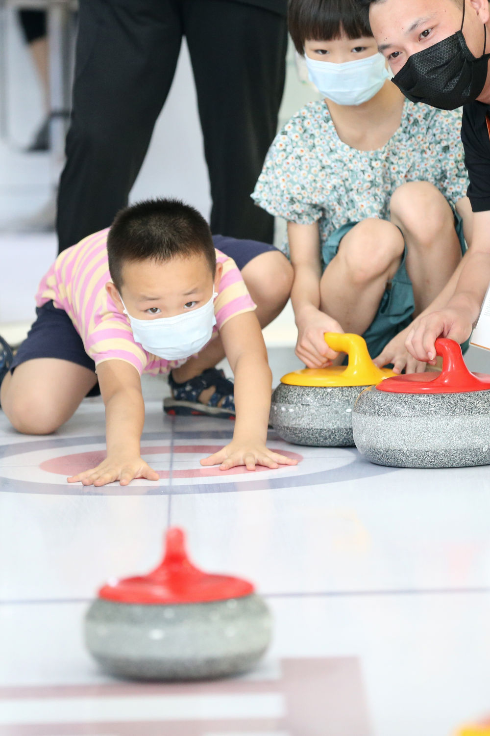 2020年9月5日,一名儿童在国际冬季运动(北京)博览会的冬季运动专题展区体验掷冰壶。新华社记者李明摄