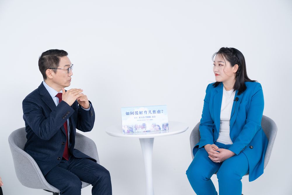 ↑访谈现场照片。图为育儿专家崔玉涛(左),新华社记者高洁(右)。