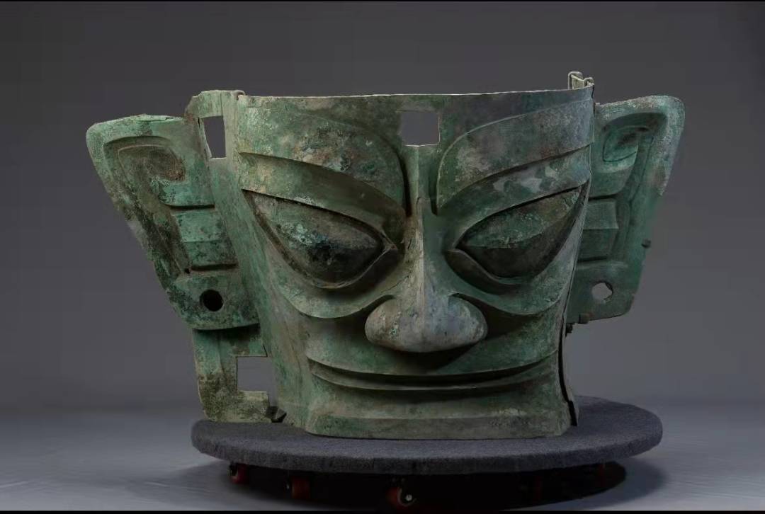 青铜大面具宽131cm、高71cm、深66cm,重131斤,是目前已知三星堆遗址出土的体量最大、保存状况完好的大型青铜面具。其宽颐广额、棱角分明,眉部、眼睛、嘴唇等线条流畅、皆突出于面部,粗长眉作扬起状,面具的两侧上下及额部正中有方形穿孔,可能是用于固定用途。青铜大面具是三星堆文化典型器物,距今已有3000多年的历史,体现了古蜀先民对自然万物与人神世界的理解与思考。