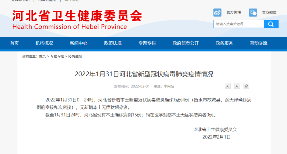 2022年1月31日0—24时,河北省新增本土新型冠状病毒肺炎确诊病例4例(衡水市故城县,系天津确诊病例的密接和次密接),无新增本土无症状感染者。