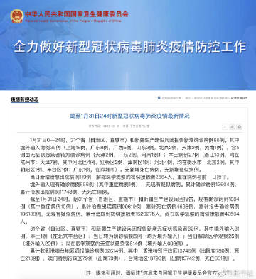 截至1月31日24时,据31个省(自治区、直辖市)和新疆生产建设兵团报告,现有确诊病例1884例(其中重症病例10例),累计治愈出院病例99619例,累计死亡病例4636例,累计报告确诊病例106139例,无现有疑似病例。累计追踪到密切接触者1529275人,尚在医学观察的密切接触者42504人。
