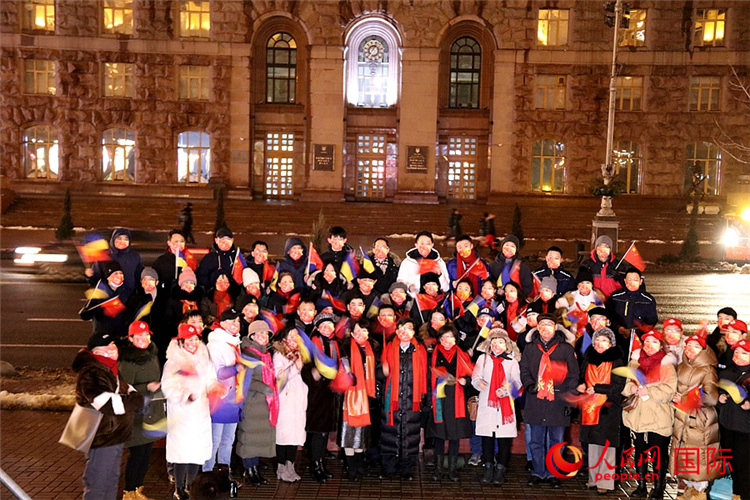 | 中国驻乌克兰使馆全体外交官和乌克兰华侨华人代表在现场深情演唱冬奥会主题曲《一起向未来》,预祝北京冬奥会圆满成功。谭武军摄 |