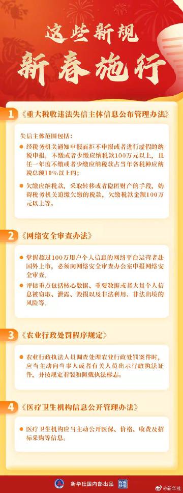 【权威快报|新规迎新春!#一批重要新规2022年2月起施行#】虎年新春,一批新规开始施行。欠税逾100万元或被纳入重大税收违法失信主体;加强对网络平台赴国外上市的网络安全审查;医疗卫生机构应当主动公开招标采购等信息……不断完善的法治,让新的一年更加“虎虎生威”。戳大图了解!