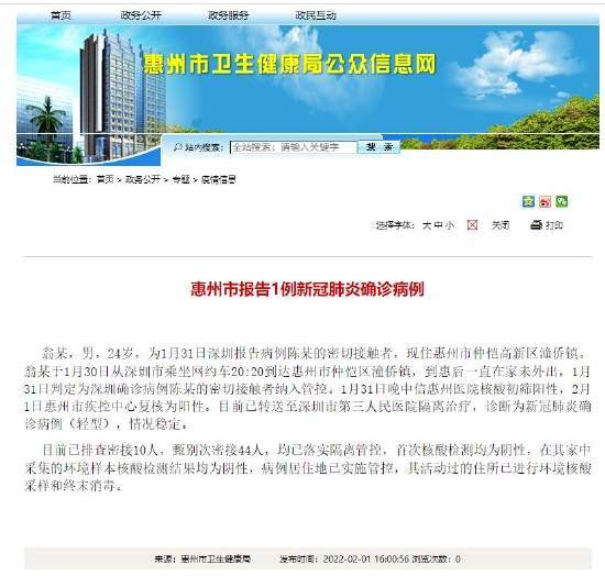 翁某,男,24岁,为1月31日深圳报告病例陈某的密切接触者,现住惠州市仲恺高新区潼侨镇。翁某于1月30日从深圳市乘坐网约车20:20到达惠州市仲恺区潼侨镇,到惠后一直在家未外出,1月31日判定为深圳确诊病例陈某的密切接触者纳入管控。1月31日晚中信惠州医院核酸初筛阳性,2月1日惠州市疾控中心复核为阳性。目前已转送至深圳市第三人民医院隔离治疗,诊断为新冠肺炎确诊病例(轻型),情况稳定。