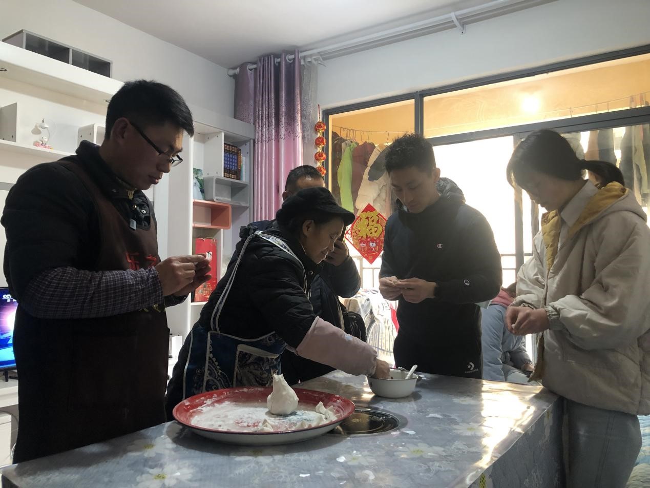 云南省昭通市镇雄县脱贫群众苏豪(左一)和家人在包汤圆。