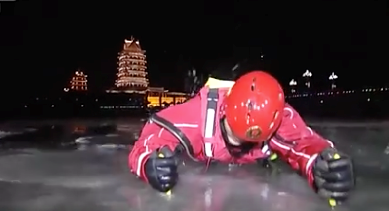 中央广播电视总台宁夏站记者许波体验夜间冰河救援演练。