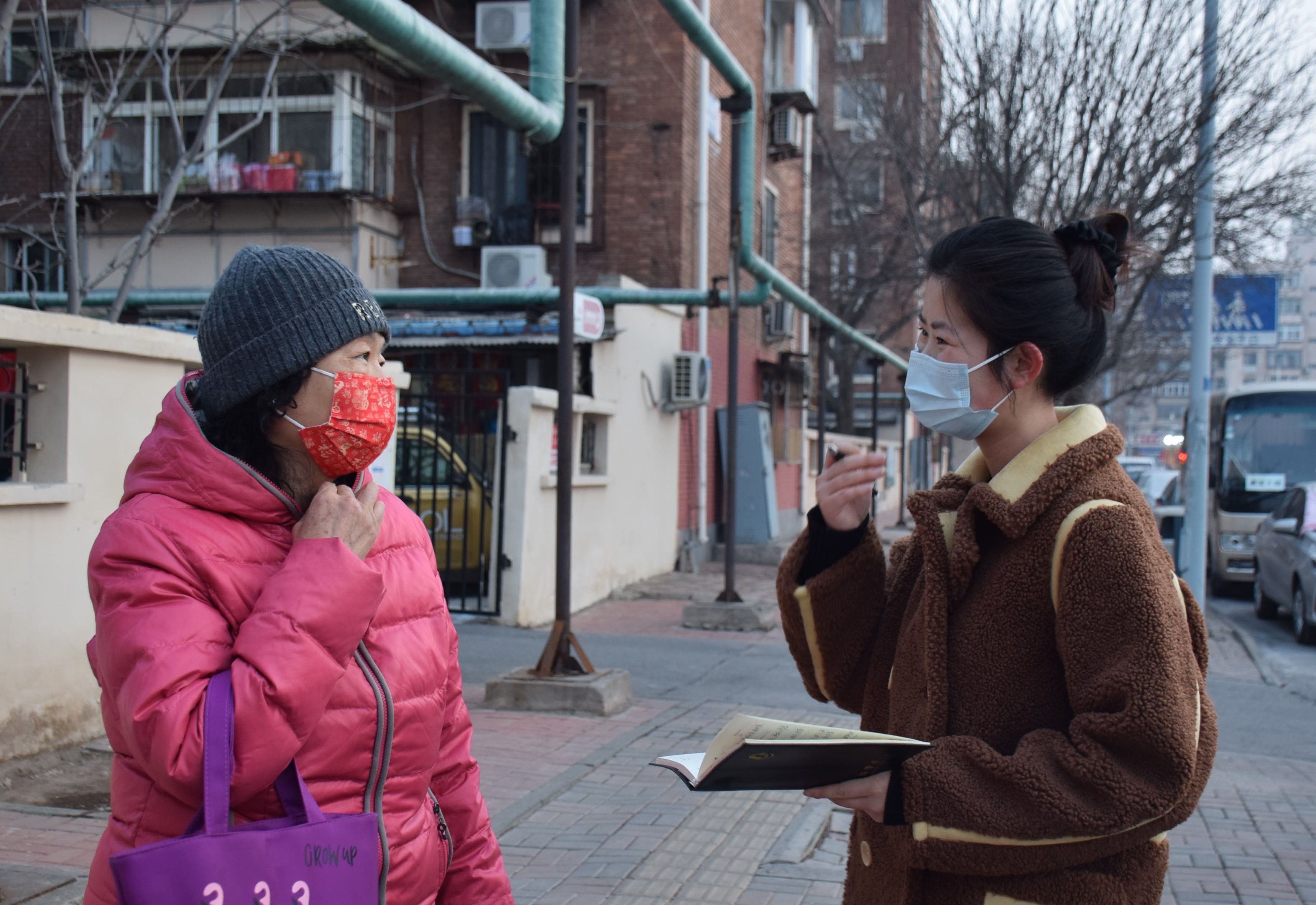 新华社记者白佳丽(右)正在采访天津市居民。