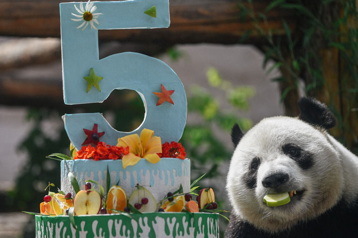 2021年7月31日,在俄罗斯莫斯科动物园,大熊猫“如意”享用工作人员为它准备的“生日蛋糕”。新华社发(叶甫盖尼·西尼岑摄)