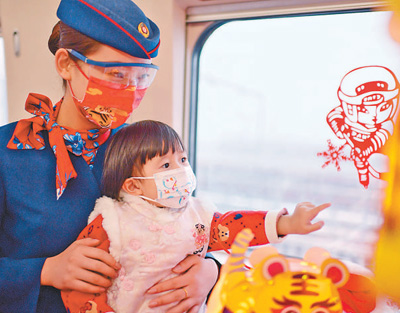 中国铁路郑州局集团有限公司郑州客运段值乘的G1576次列车上,列车员与小乘客亲切互动,欢度佳节。赵晶晶 闫 波摄(人民视觉)