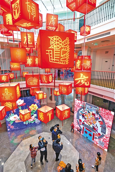 北京市前门北京坊举办“赏年画过大年”活动,人们在欣赏年画中感受优秀传统文化的魅力。陈晓根摄(影像中国)