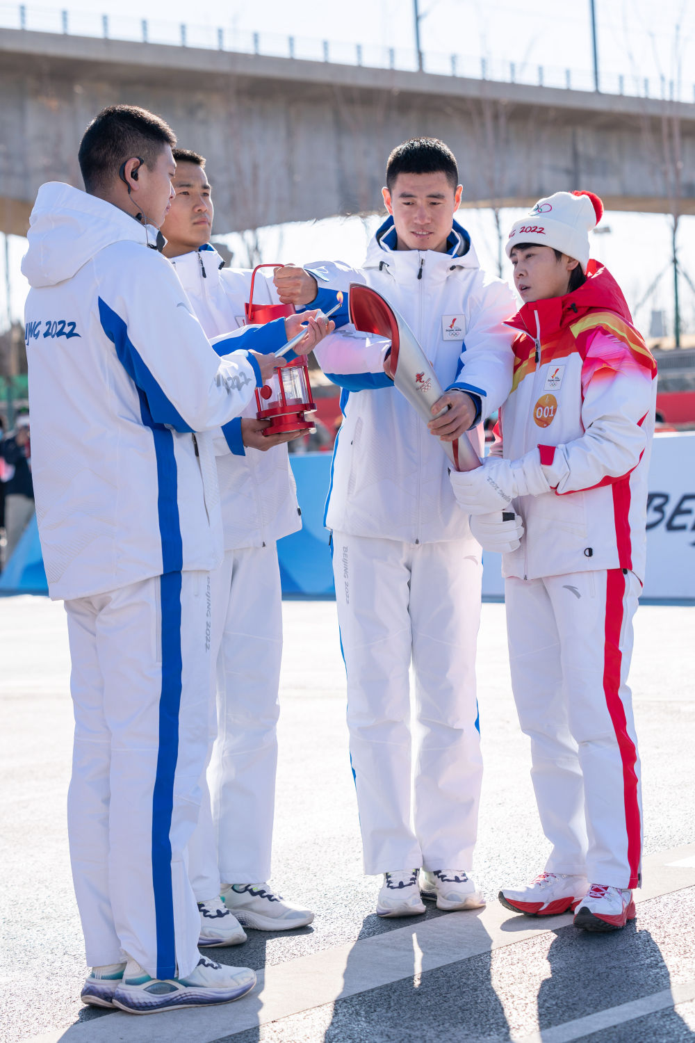 ↑2月2日,火种护卫队员点燃火炬手王濛(右一)的火炬。