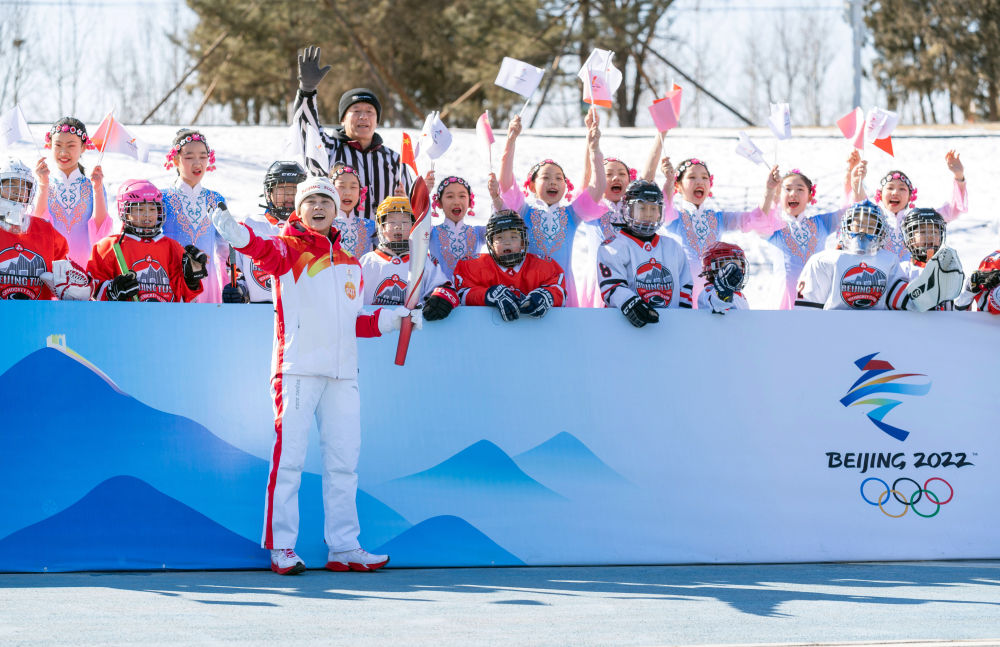 ↑2月2日,火炬手王濛(前)与冰球小选手合影。