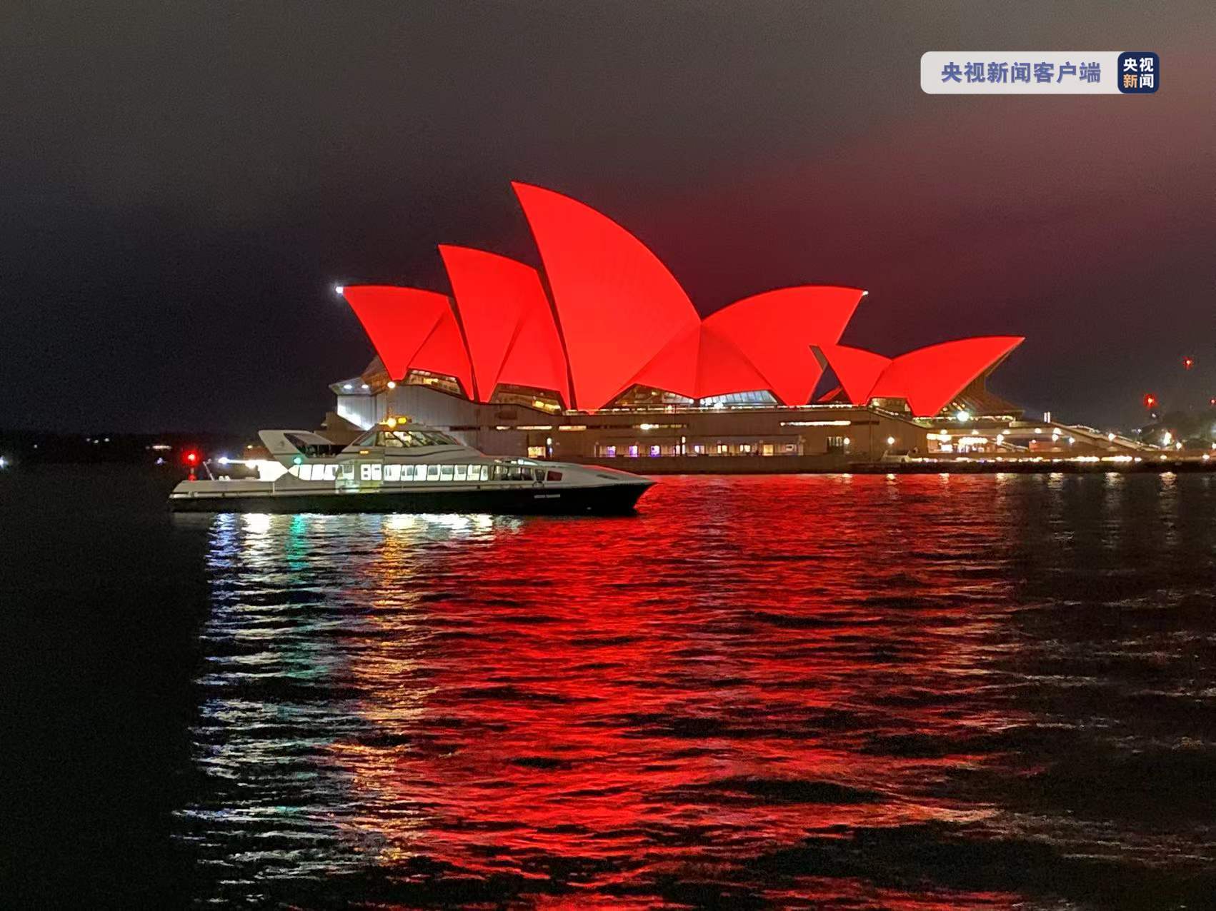 当地时间2月2日晚,为庆祝中国春节,澳大利亚最大城市悉尼当地最具标志性建筑悉尼歌剧院利用立体投影技术点亮“中国红”。(总台记者 王聪)
