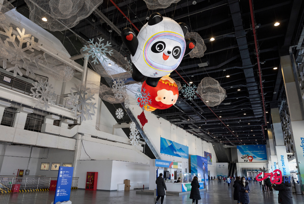 主媒体中心的一楼大厅上方,北京冬奥会吉祥物冰墩墩和冬残奥会吉祥物雪容融悬挂其间。代表中国传统文化元素的纸鸢,也带来了春天的气息。