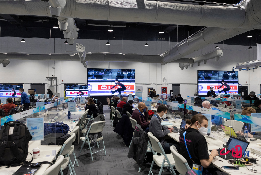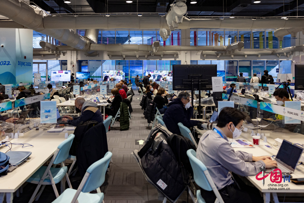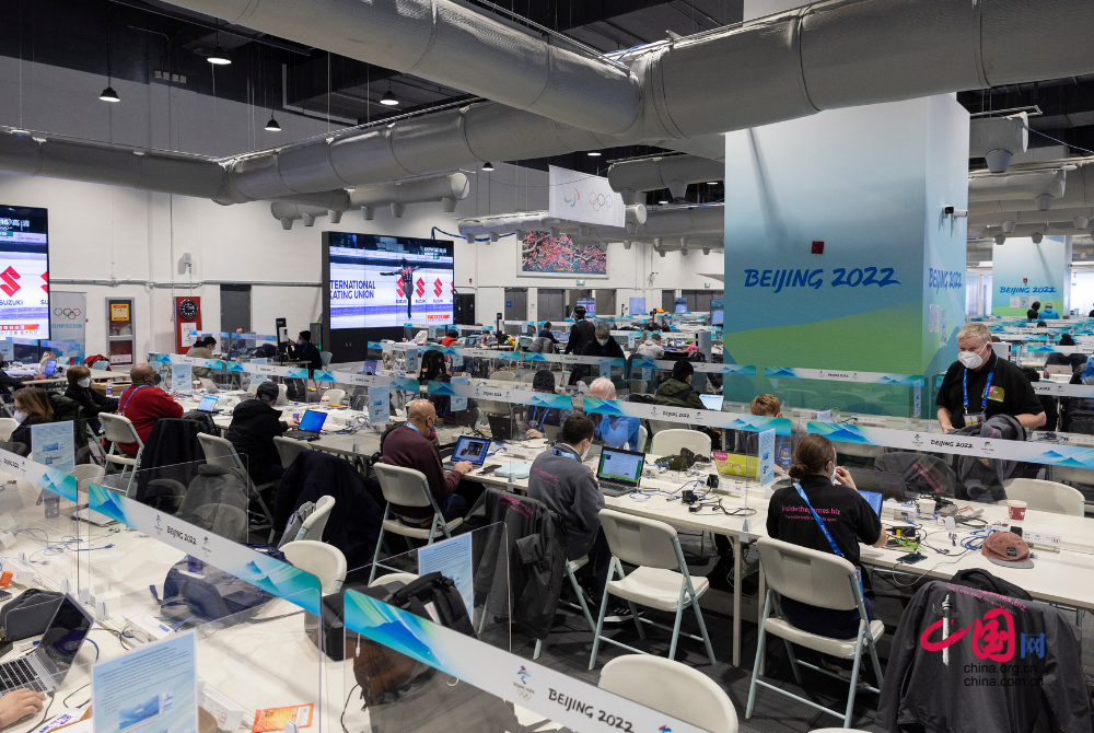 此时此刻,敲击键盘的声音此起彼伏,各种语言的交流回响耳畔,中国和北京冬奥的故事、声音从这里发出,传向世界。