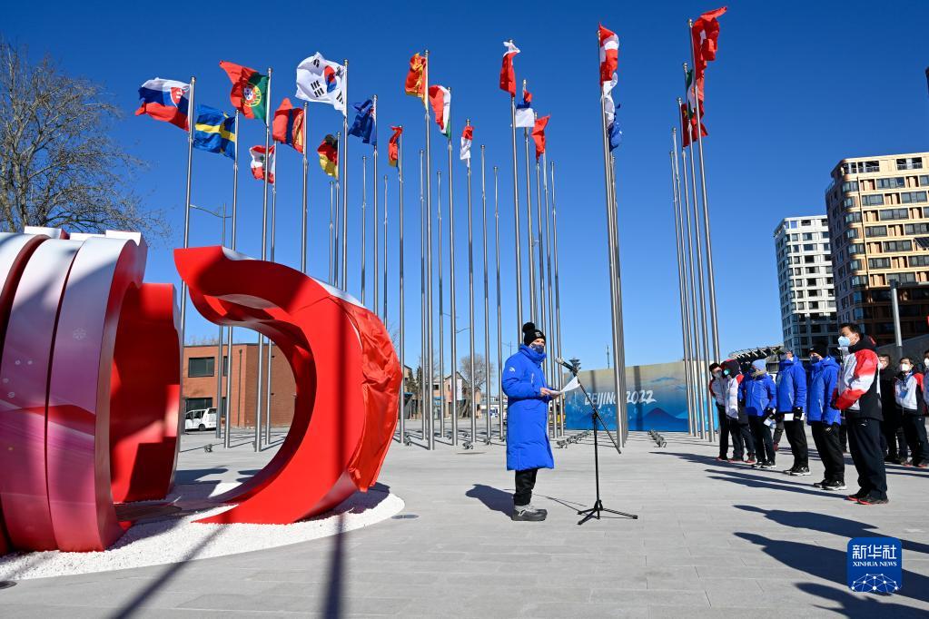 2月1日上午,国际奥委会主席巴赫在休战壁画前讲话。