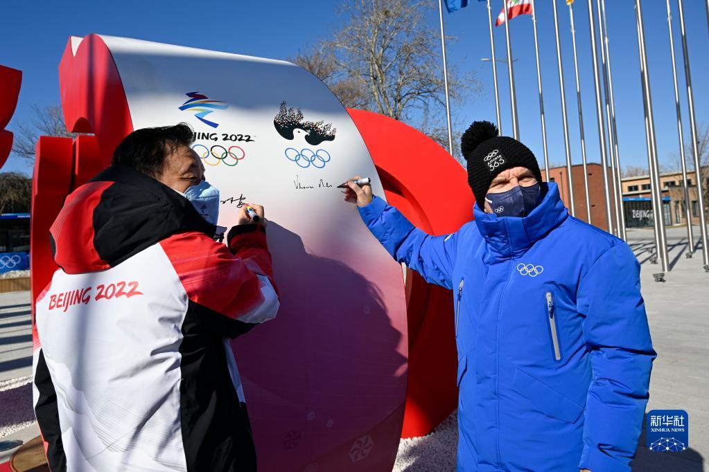 2月1日上午,国际奥委会主席巴赫(右)在休战壁画上签名。