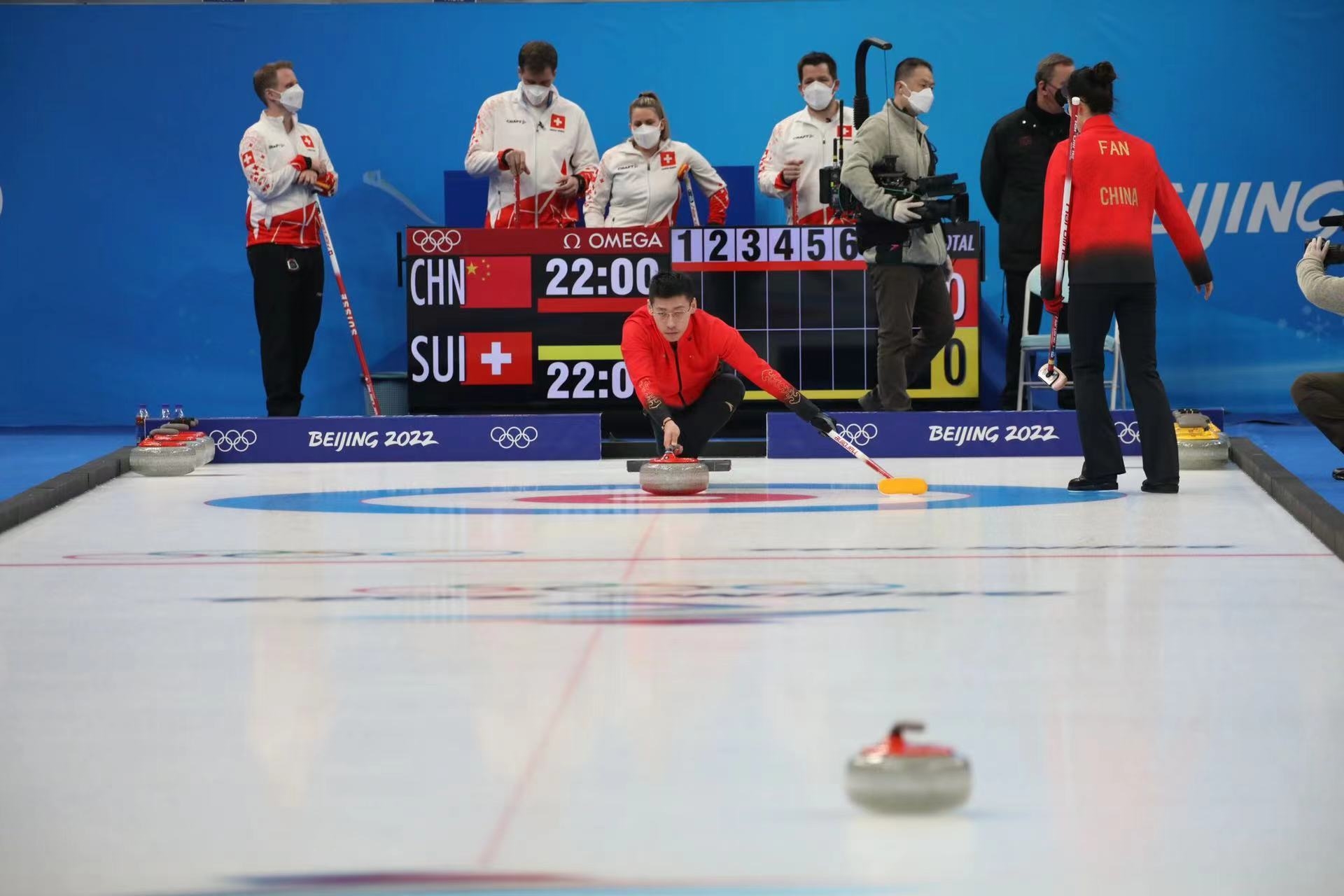 中国队将在冰壶混双比赛中对阵瑞士队,图为赛前场地练习(人民日报客户端 巩晗 摄)