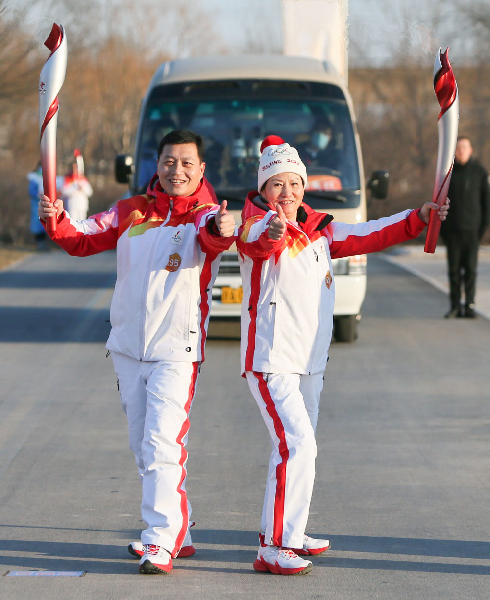 2月2日,火炬手李秀平(右)与李学征进行火炬传递。 新华社记者孟晨光摄