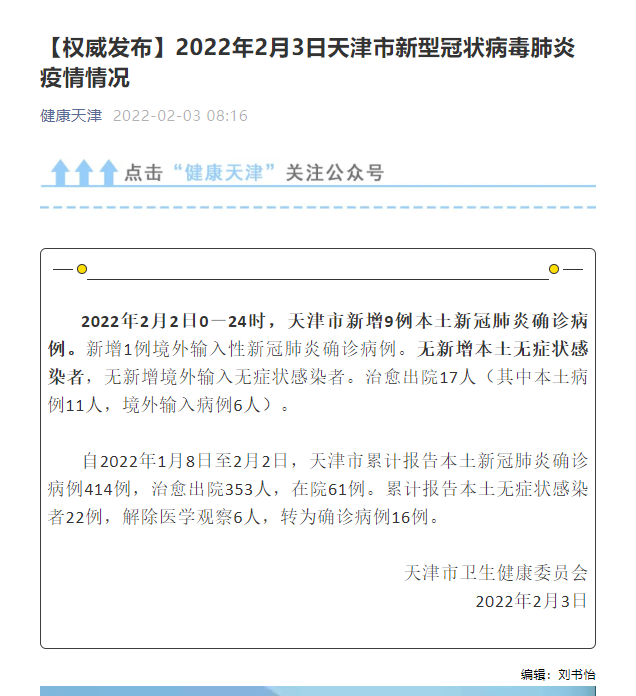 2022年2月2日0-24时,天津市新增9例本土新冠肺炎确诊病例。新增1例境外输入性新冠肺炎确诊病例。无新增本土无症状感染者,无新增境外输入无症状感染者。治愈出院17人(其中本土病例11人,境外输入病例6人)。
