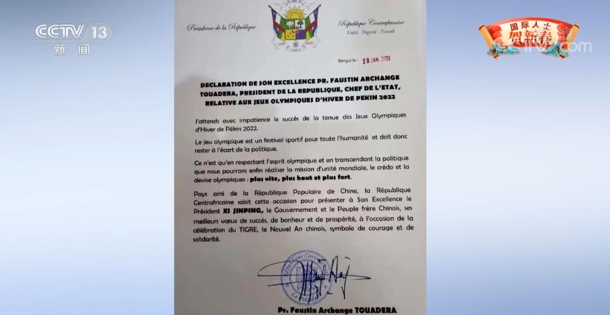 中非共和国总统图瓦德拉近日也发表声明,送来新春祝福,并祝北京2022年冬奥会成功举办。