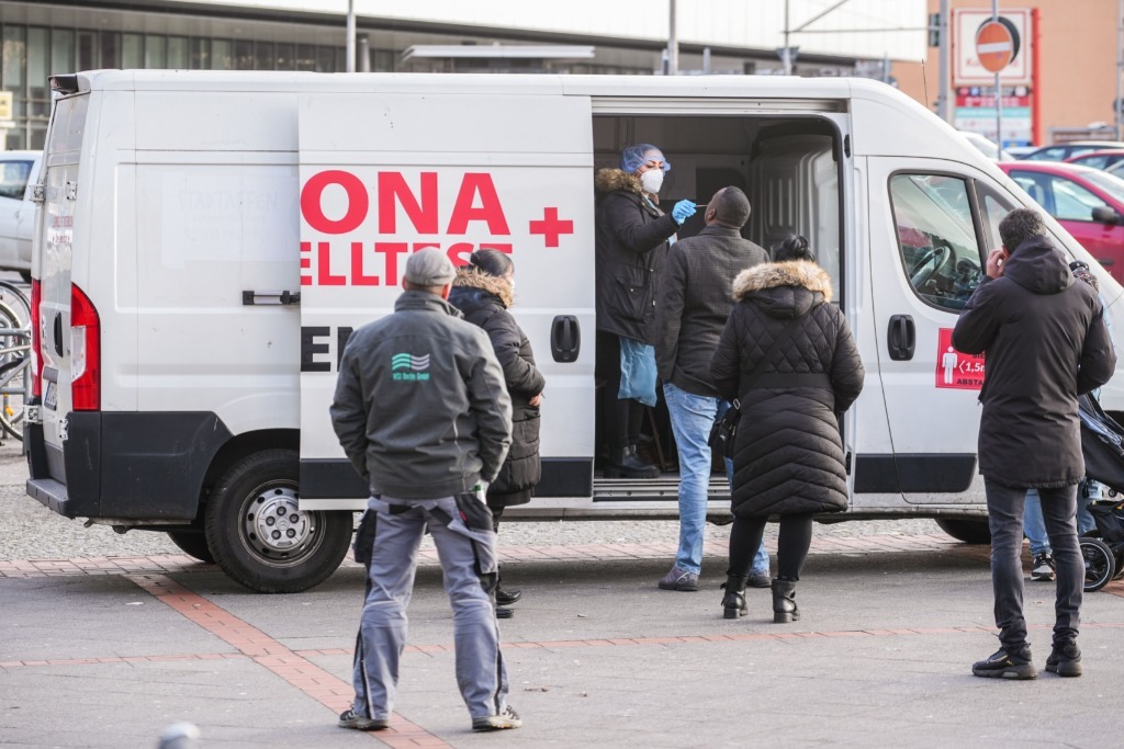 2月2日,人们在德国首都柏林一处移动新冠检测点排队接受检测。(新华社发,斯特凡·蔡茨摄)