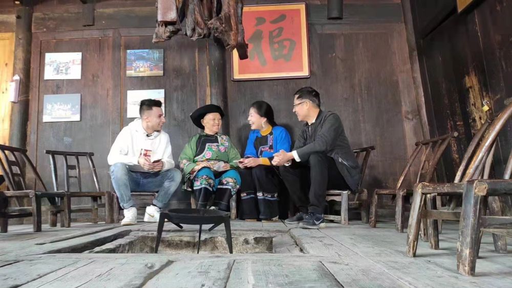 贾思德(左一)在湖南湘西花垣县十八洞村少数民族村民家中参与节目录制。(贾思德供图)
