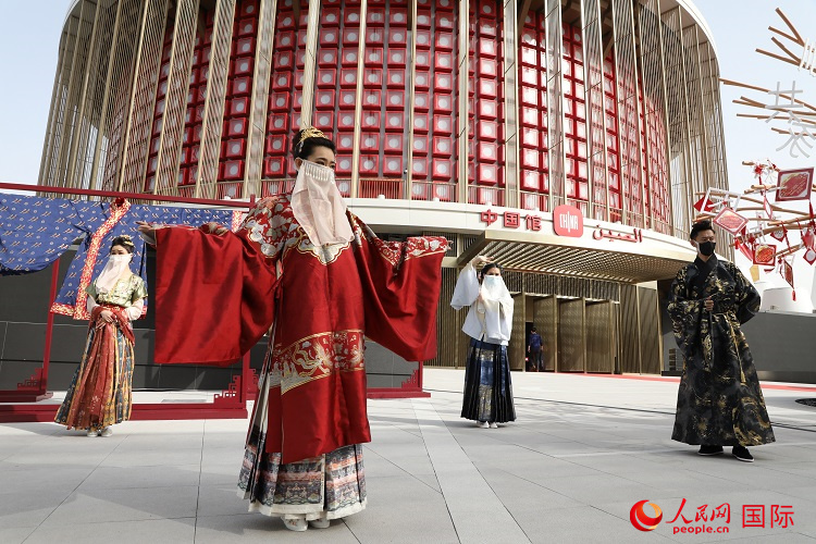 迪拜世博会中国馆外的汉服展示。人民网记者 周輖摄