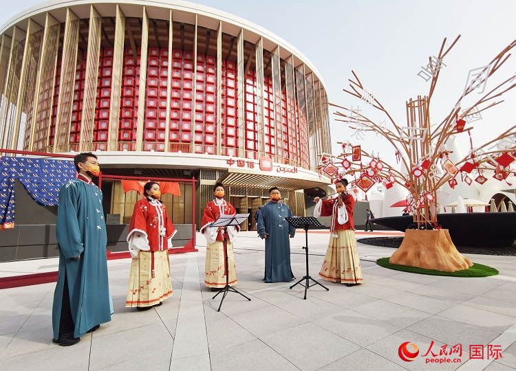 迪拜世博会中国馆外表演音乐快闪。人民网记者 沈小晓摄