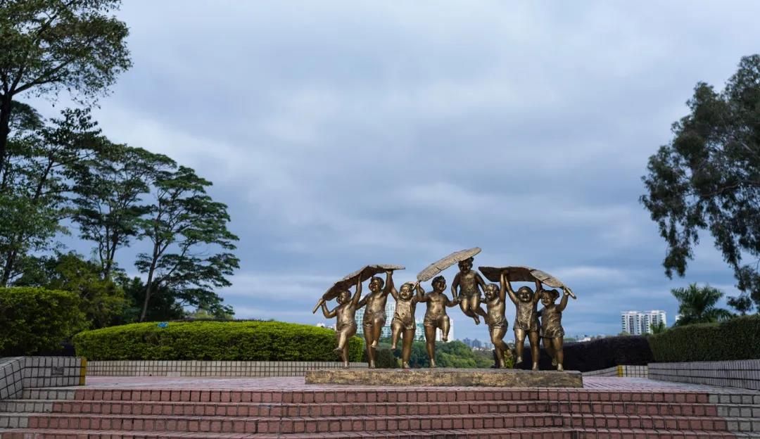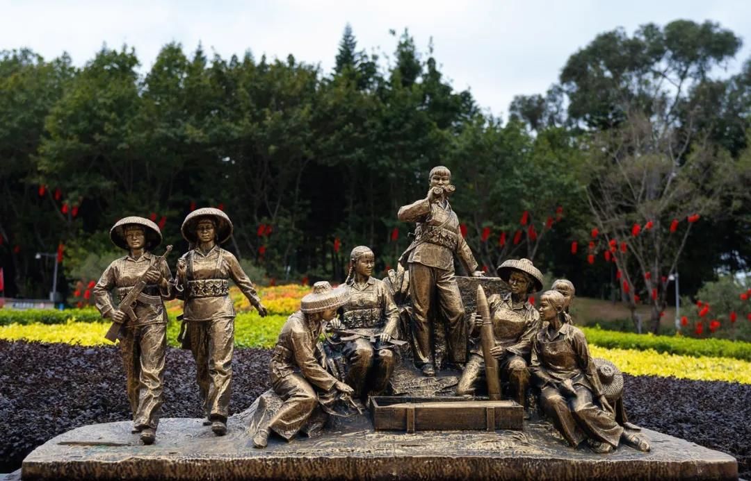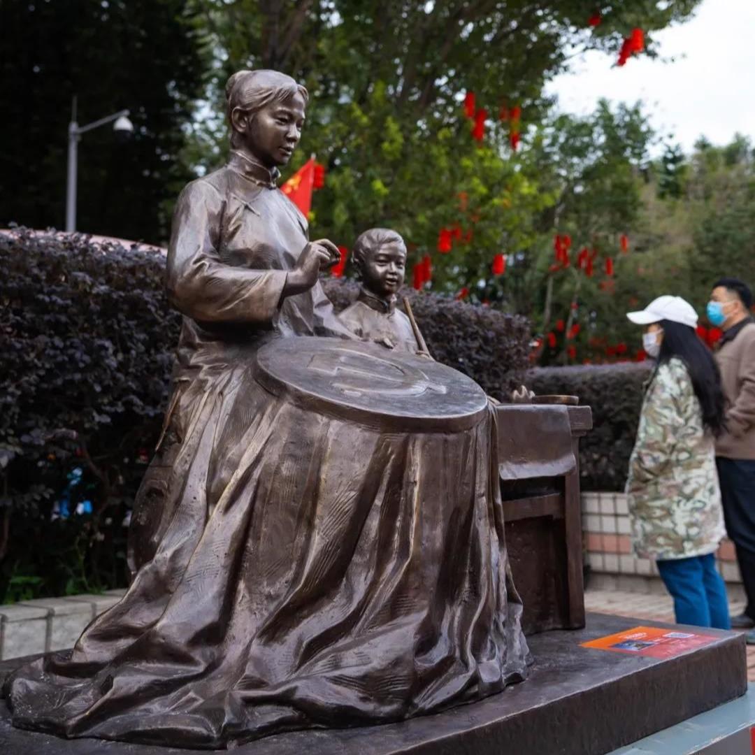 天河公园南广场展出的许鸿飞雕塑作品共9件,包括反映新时代农村面貌的作品《丰年》、《东乡绣娘》;建党百年创作的主旋律作品《不忘初心》、《西岛女民兵》;表达人民对美好生活向往的作品《落雨大》、《仙乐飘飘》;“抗疫”系列作品《丰碑》等。