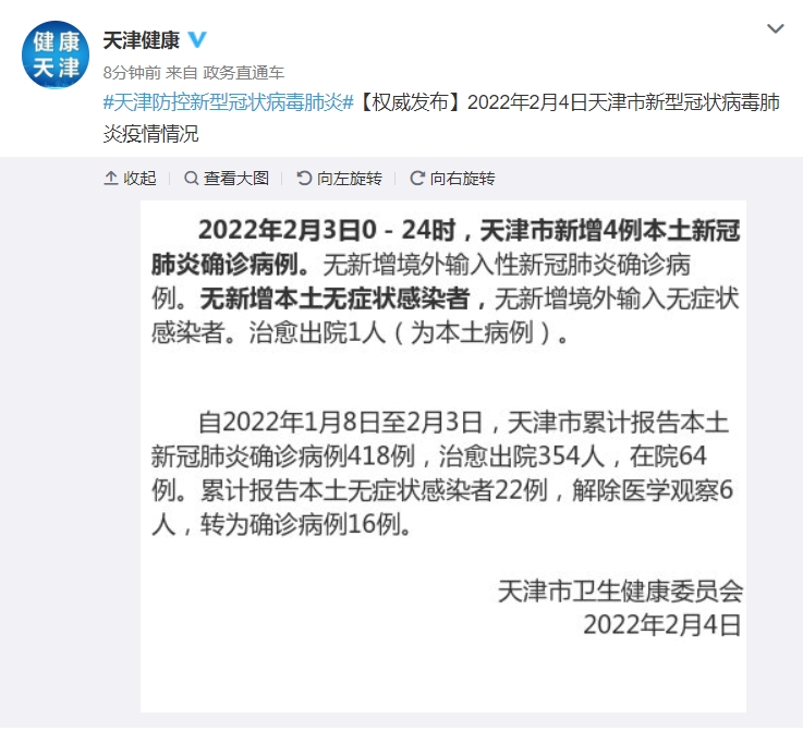 原标题:2022年2月4日天津市新型冠状病毒肺炎疫情情况