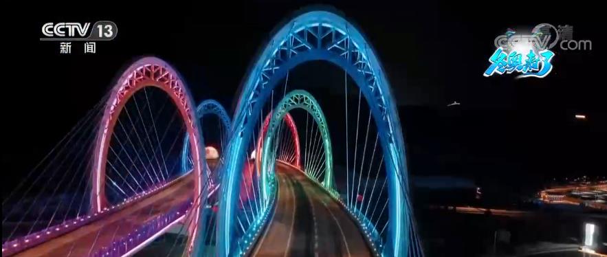 冬奥冰雪五环桥,位于张家口赛区崇礼核心区的太子城高速出入口,它以“冰雪五环”为设计创意,是延崇高速上最具奥运特色的景观桥梁。在炫彩灯光的装点下,大桥流光溢彩、熠熠生辉,变幻的灯光将山、桥和城串联起来,宛若游龙。