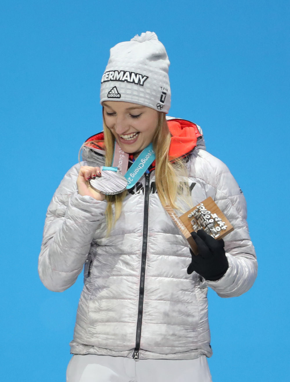 2018年2月13日,在平昌冬奥会跳台滑雪女子标准台比赛中获得亚军的德国选手阿尔特豪斯在颁奖仪式上。新华社记者白雪飞摄
