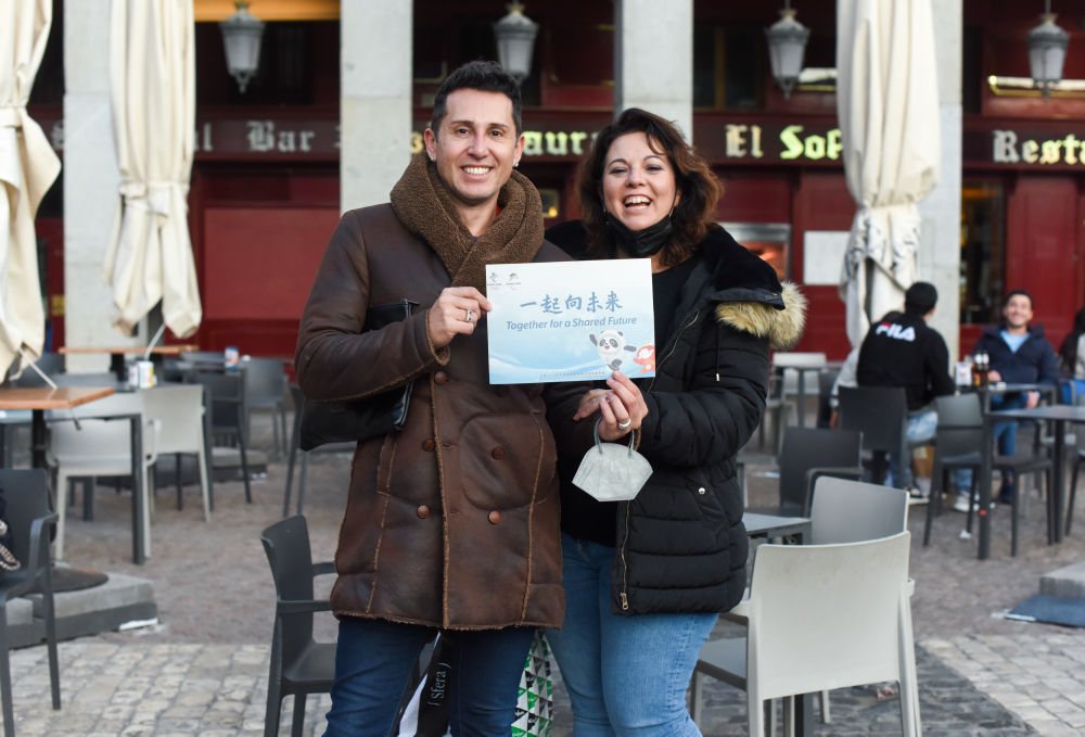 1月18日,在西班牙马德里,歌剧演员豪尔赫·罗德里格斯-诺顿(左)与卡门·索利斯 手举“一起向未来”的主题口号,祝福北京冬奥会。新华社记者孟鼎博摄