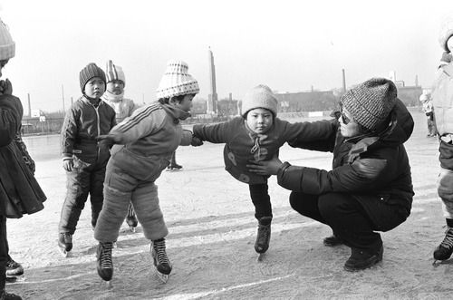 图为1987年1月4日,一名体育教师(右)在哈尔滨道外体育幼儿园辅导四岁的小朋友学滑冰。 新华社发